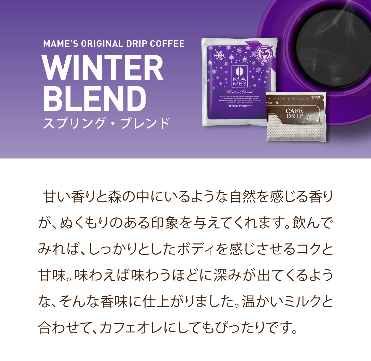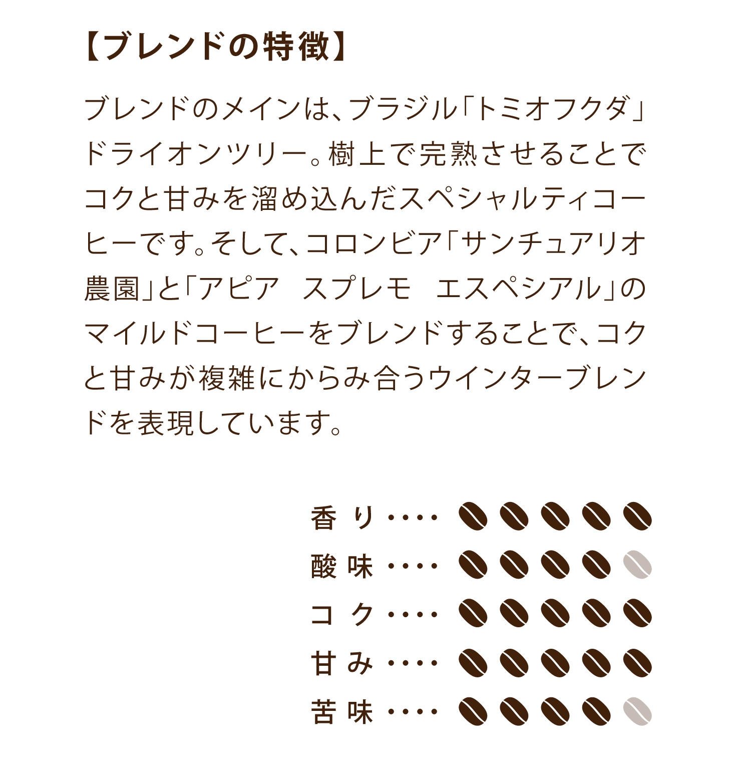 甘い香りと森の中にいるような自然を感じる香りが、ぬくもりのある印象を与えてくれます。飲んでみれば、しっかりとしたボディを感じさせるコクと甘味。味わえば味わうほどに深みが出てくるような、そんな香味に仕上げました。