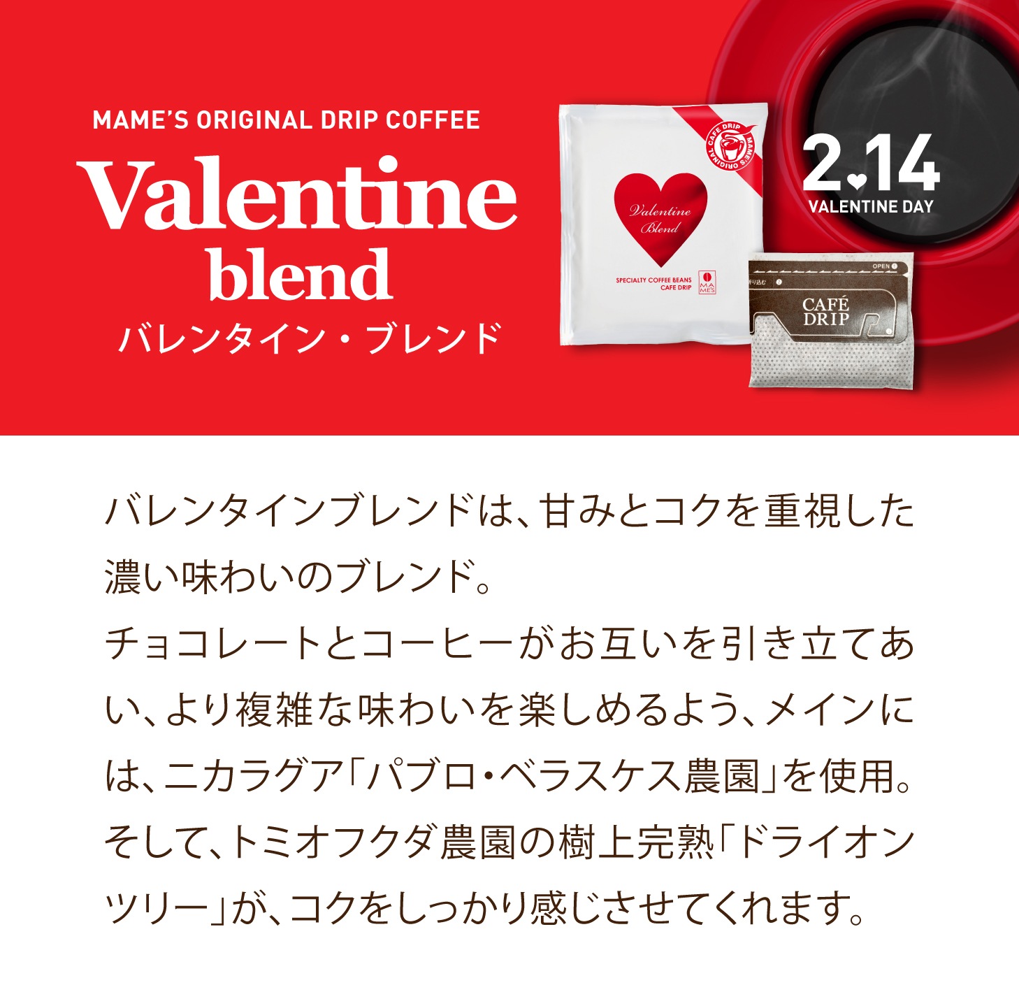 今年のバレンタインブレンドは、甘みとコクを重視した濃い味わいのブレンド。