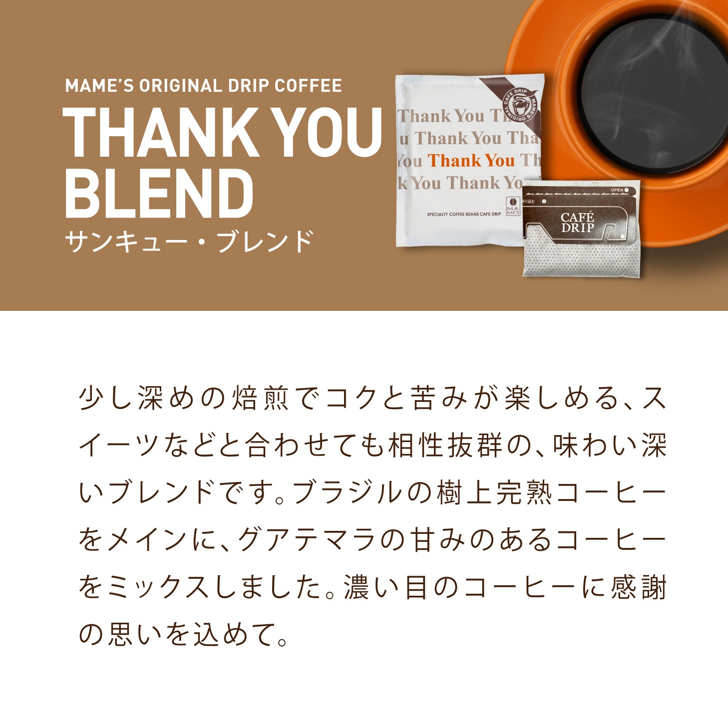 少し深めの焙煎でコクと苦みが楽しめる、スイーツなどと合わせても相性抜群の、味わい深いブレンドです。ブラジルの樹上完熟コーヒーをメインに、グアテマラの甘みのあるコーヒーをミックスしました。濃い目のコーヒーに感謝の思いを込めて。